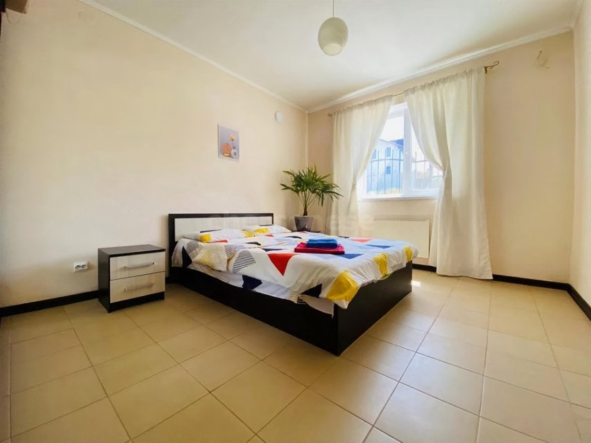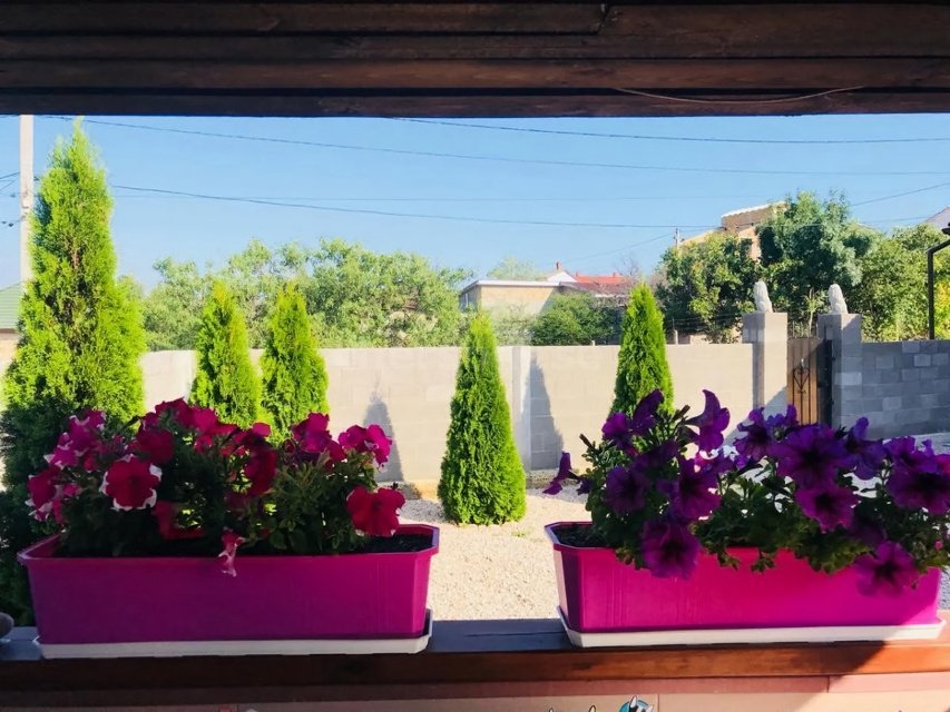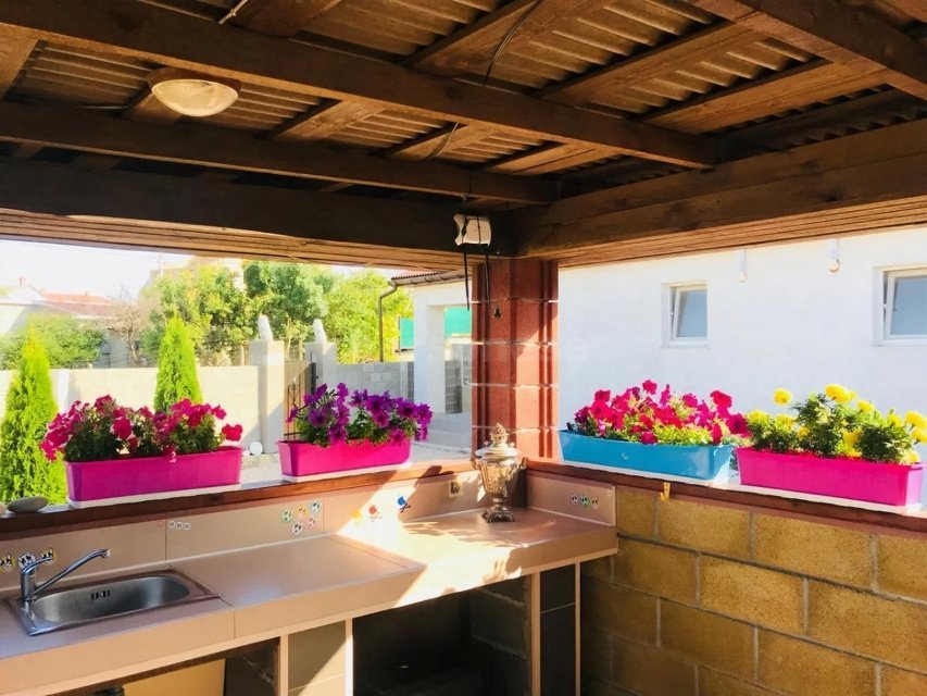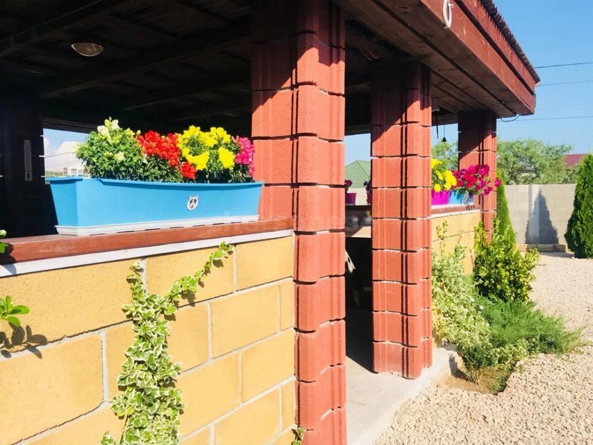 Построена из Крымского камня ракушняка в камень (стены 50 см), Каждый номер с отдельным входом. Оборудован необходимой техникой и мебелью. Площадь номера 55 метров. Всего 4 номера. Номера 2-х комнатные, у каждого свой санузел и кухня.