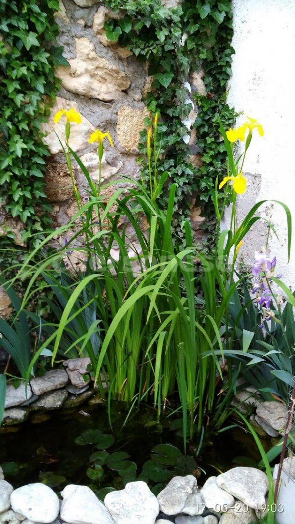Территория двора в плитке, два пруда с водяными ирисами, лилиями, рыбками, розы, много цветов.