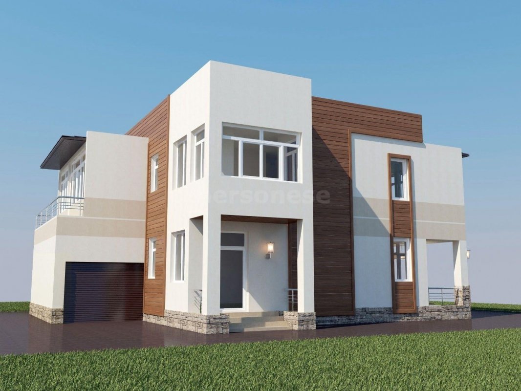 1 этаж: кухня, гостиная, 2 комнаты, санузел. Из кухни, гостиной и гостевой комнаты есть выход на большую открытую террасу. Из гаража есть вход в дом и в котельную.
