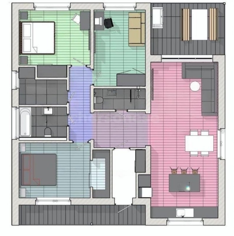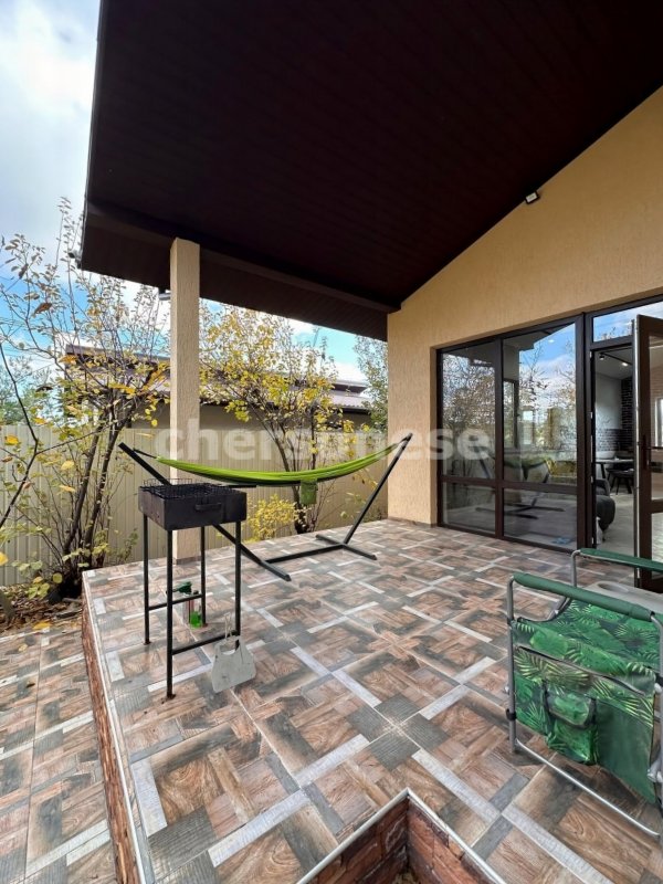 В доме три изолированных спальни, в двух небольшие гардеробные, просторная кухня-гостиная, на террасе зона мангала. Во дворе парковочная зона на две машины.