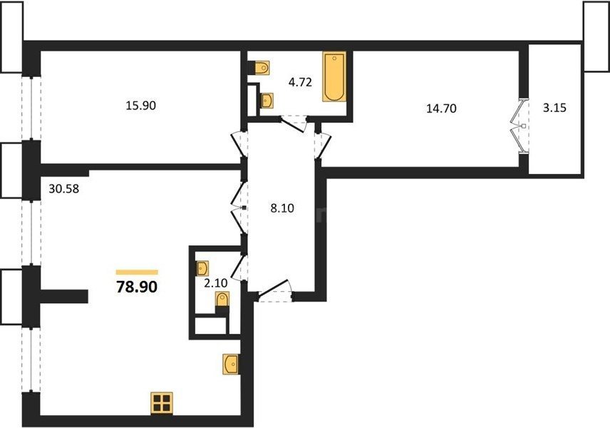 В продаже имеются квартиры в жилом комплексе "Семисчастье" премиум-класса. Общая площадь составляет 78,9002 кв.м., при этом кухня - 30,58 кв.м. Высота потолков достигает 2,7 м.