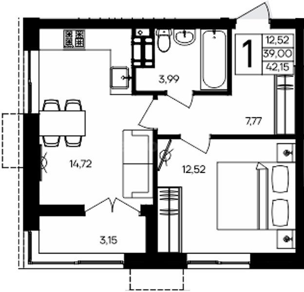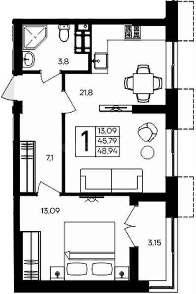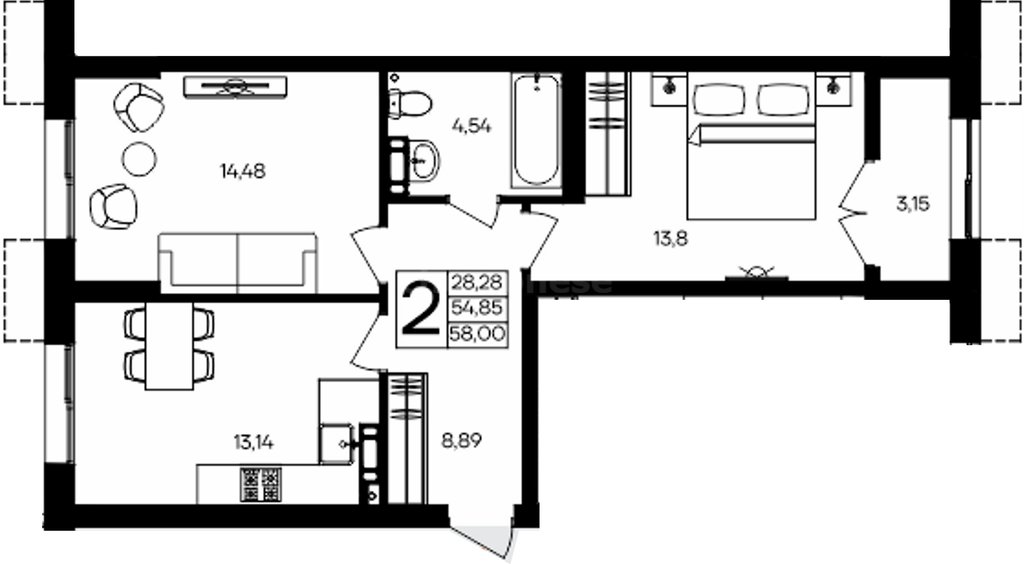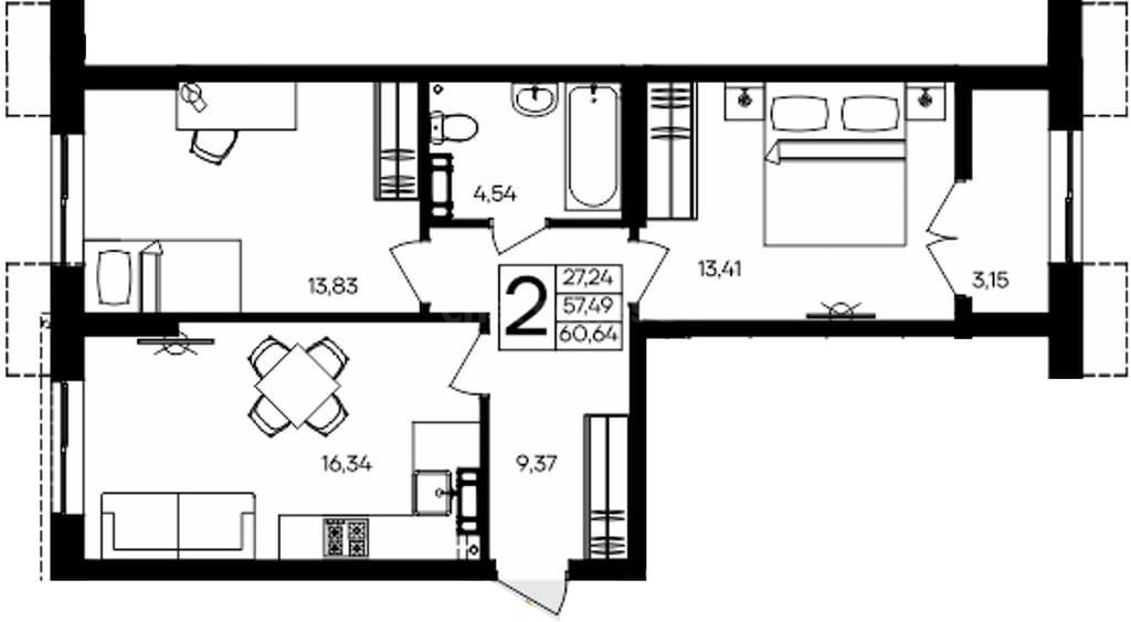 В продаже имеются квартиры в жилом комплексе "Семисчастье" премиум-класса. Общая площадь составляет 58,06 кв.м., при этом кухня - 13,14 кв.м. Высота потолков достигает 2,7 м.