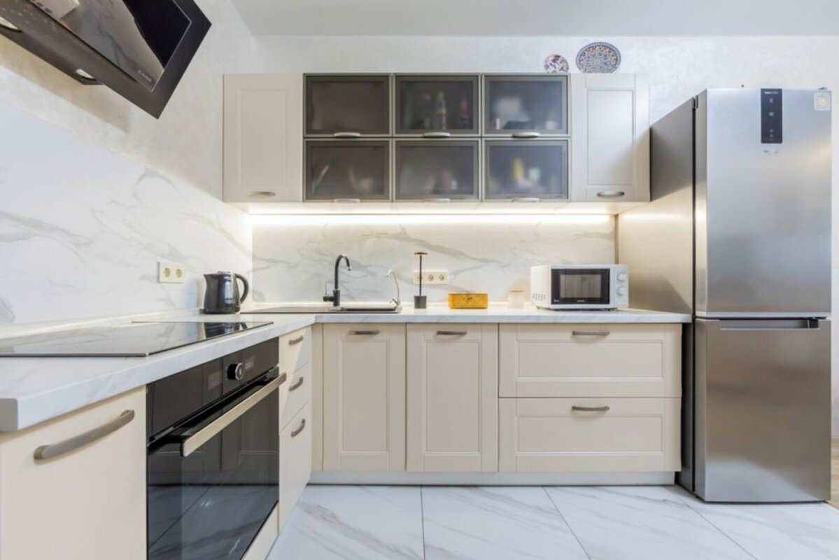 Квартира укомплектована всім необхідним: вбудовані кухонні меблі, холодильник, духова шафа, варильна поверхня, витяжка, стіл, стільці, кондиціонер, пральна машина, бойлер, розсувний диван, тумба під телевізор, комод, пуфи.