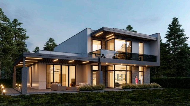 В комплектацию дома входит фундаментная плита, стены из кирпича М125, вентилируемый фасад, алюминиевые окна, 20кВт электроэнергия.