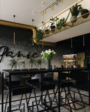 Дорогая стильная мебель, барная стойка изготовлена под заказ, кондитерская витрина, зеркальная стена, Led-вывеска. Так же есть летняя площадка с навесом (можно регулировать) и терраса с фотозоной. Рассчитано на 49 посадочных мест (26 внутри и 23 снаружи).