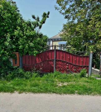 Будинок огороджений кам'яним забором з кованими воротами.