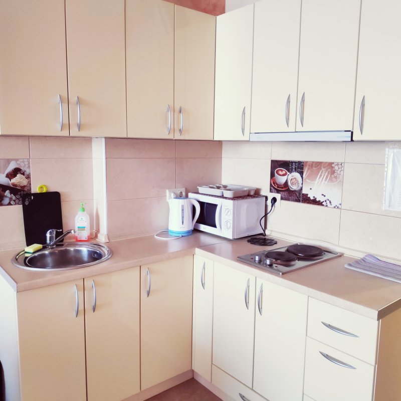 Кухня з усіма приладдям, електроплита, мікрохвильовка, посуд, витяжка, холодильник, електрочайник.