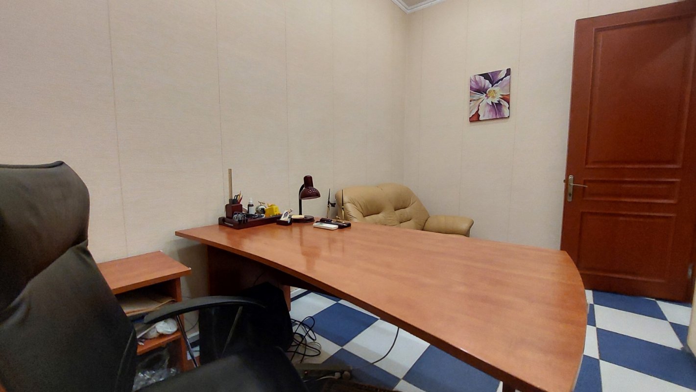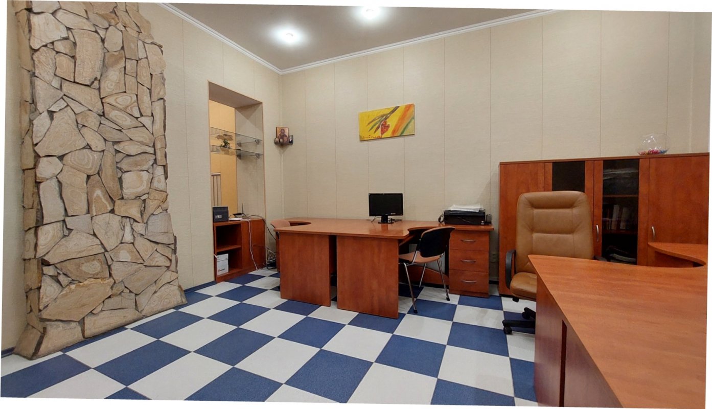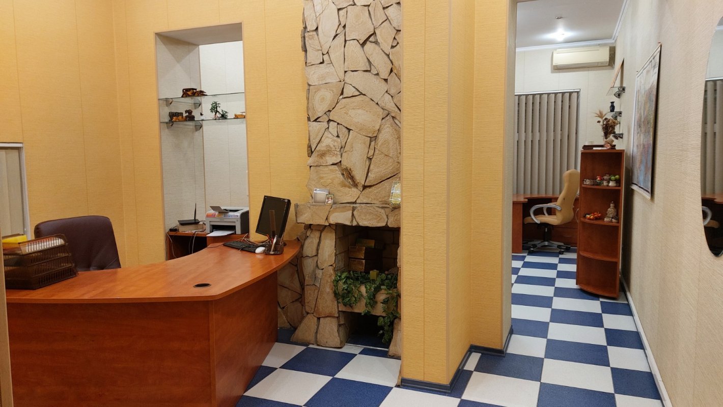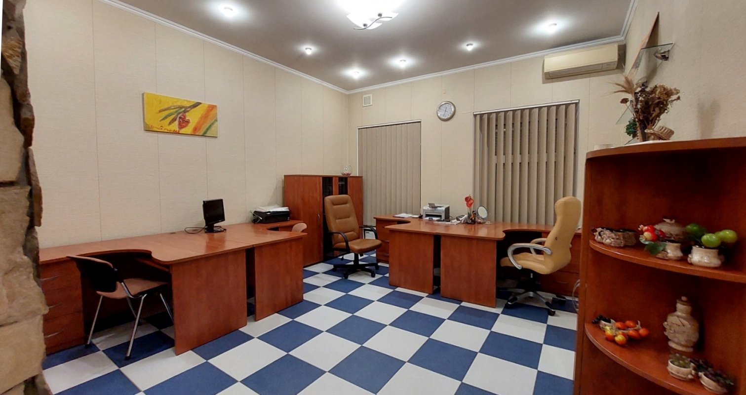 Крепкий дом из ракушечника. Вход со двора. Высокий первый этаж/4. Приемная, большой комната на четыре рабочих места, отдельный кабинет, кухня, санузел. Все помещения с окнами. Ролеты. Офисная мебель. Интернет (Тенет). Отопление – АГВ. Два кондиционера. Счетчики на свет, газ и воду. Сигнализация. Закрытый двор. Сдается длительно. Цена – 15 000 грн/месяц + коммунальные платежи. Залоговая сумма + посреднические услуги.