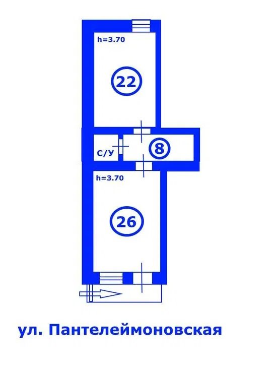 2 помещения 26 кв. м. +22, проходная комната, кладовка, санузел.