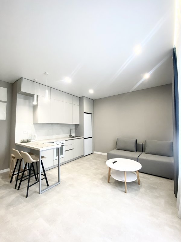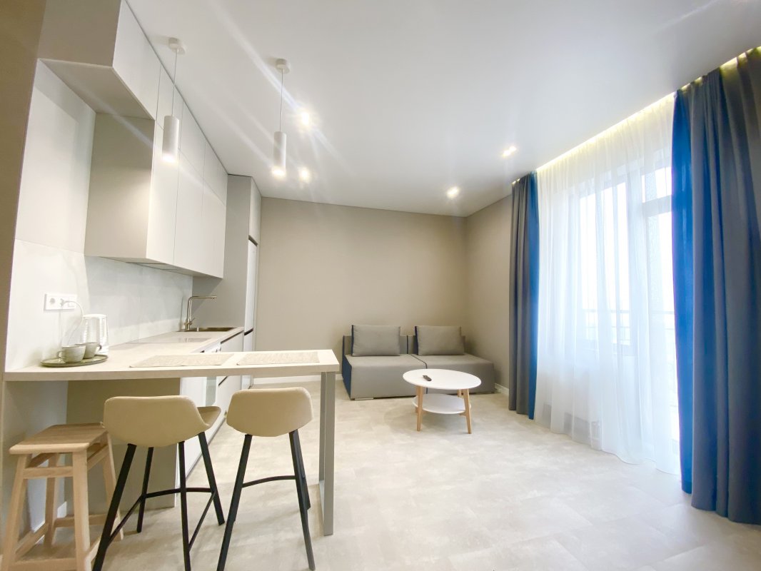 Просторная кухня гостиная с двухспальным диваном, кухня с барной стойкой.
