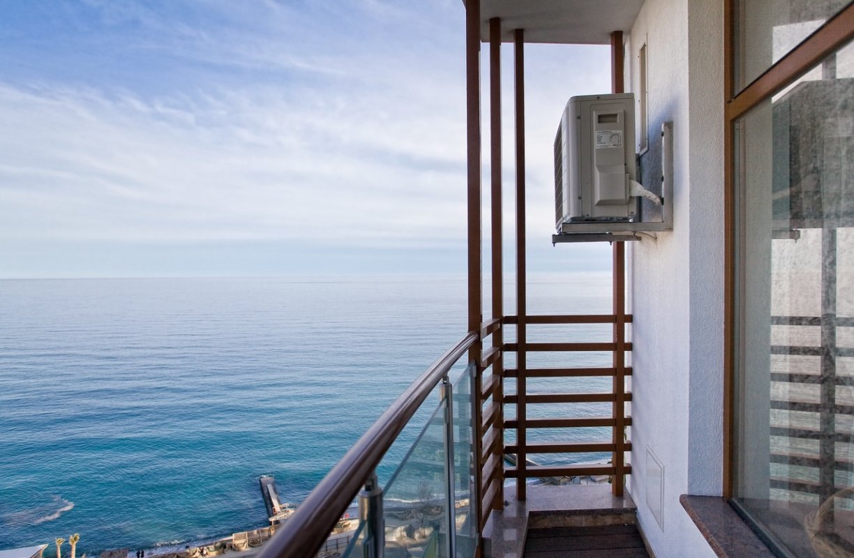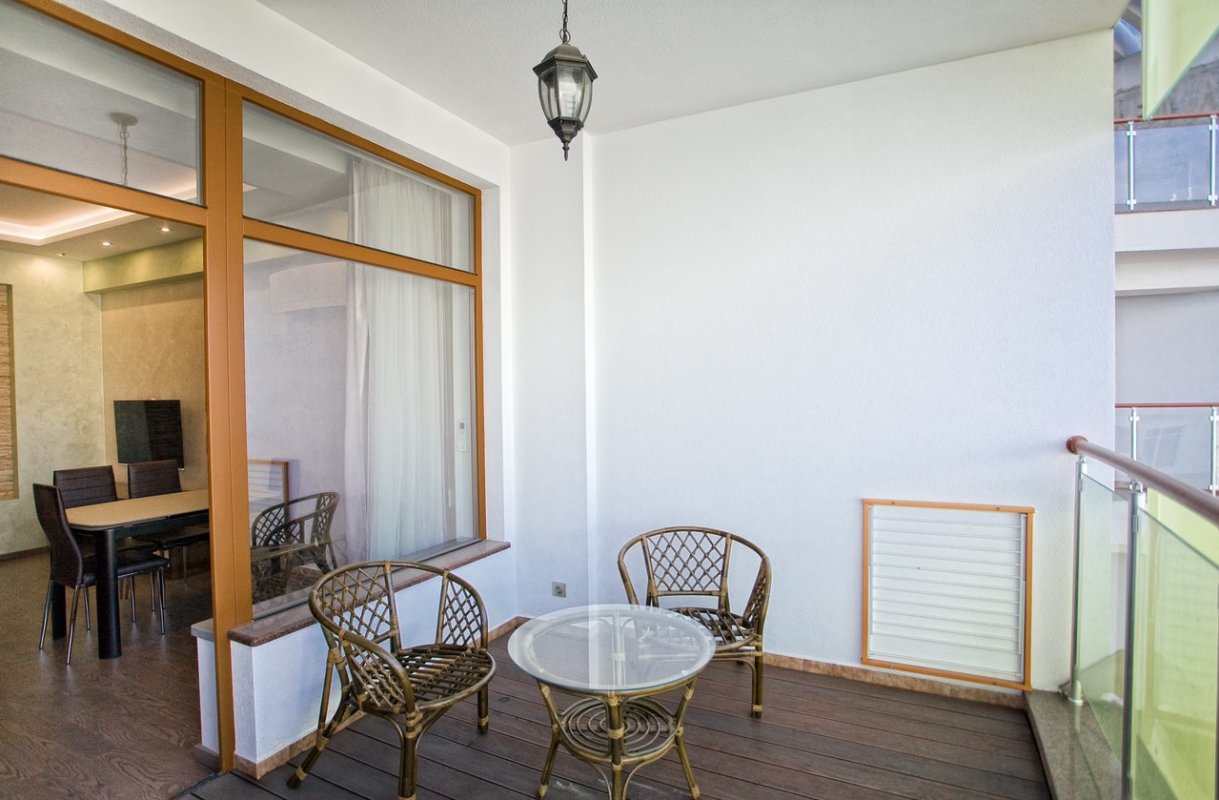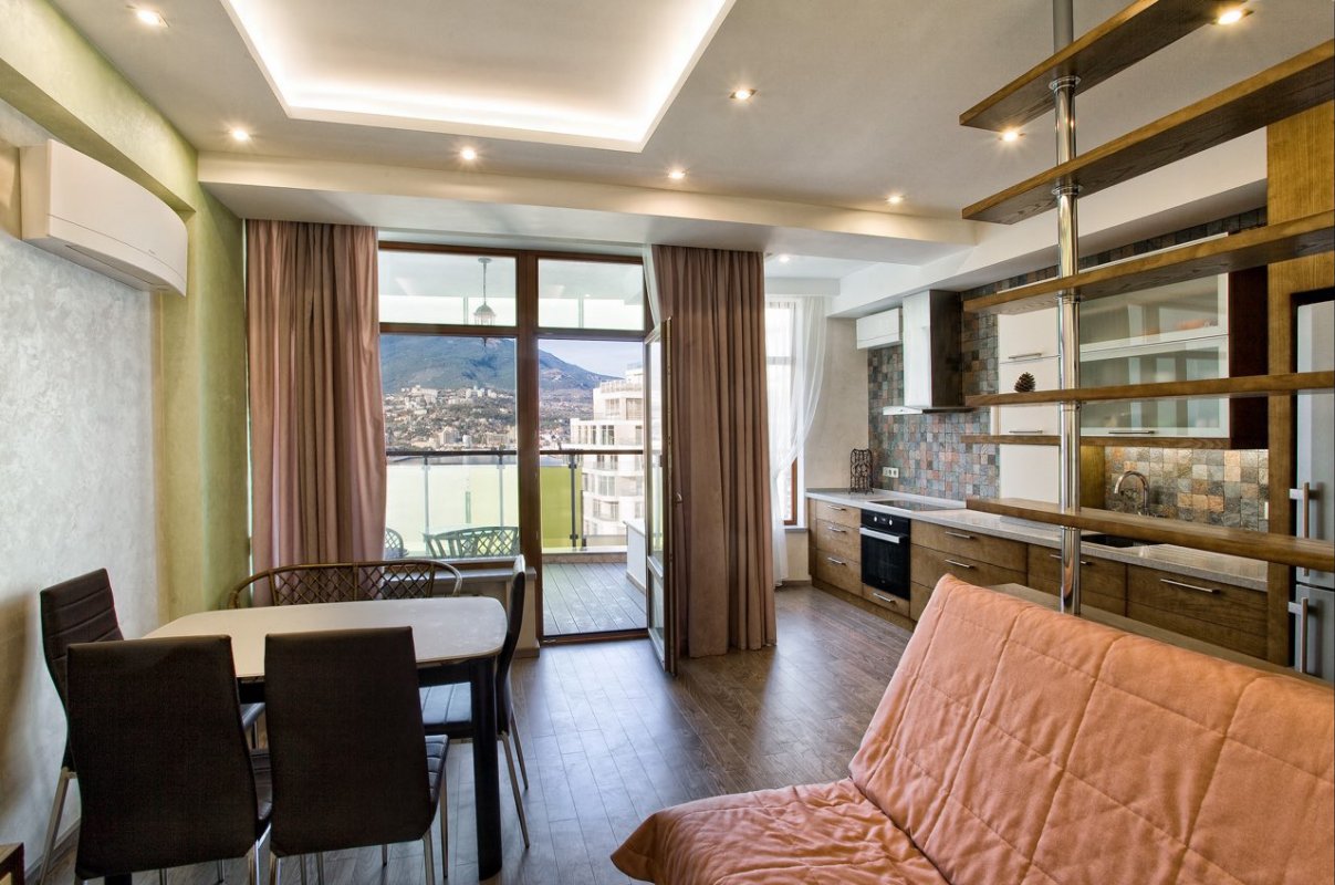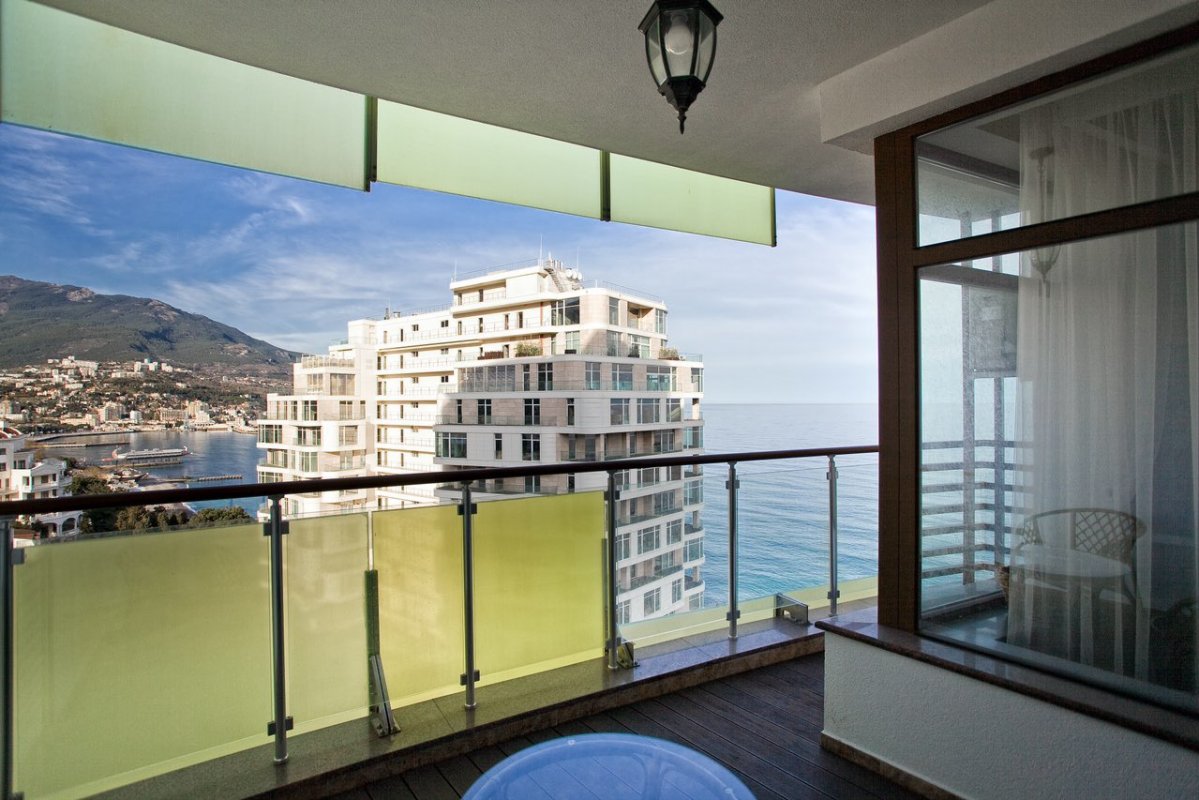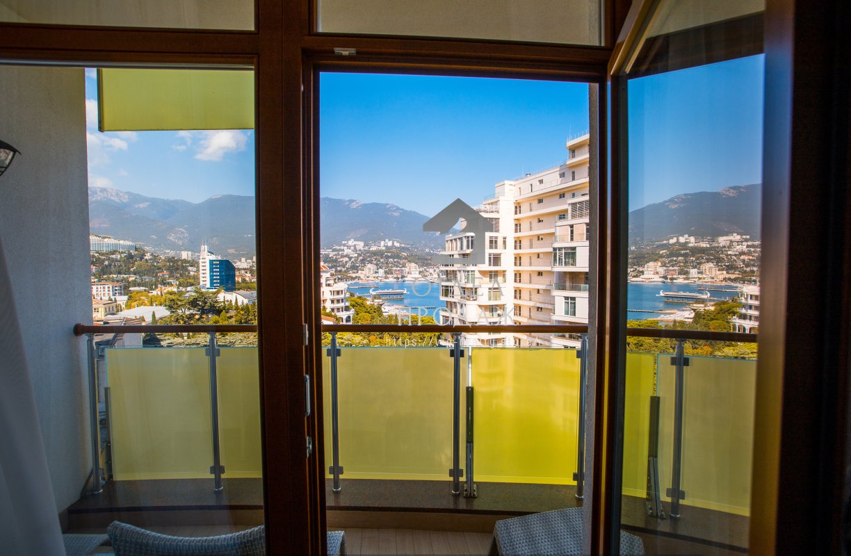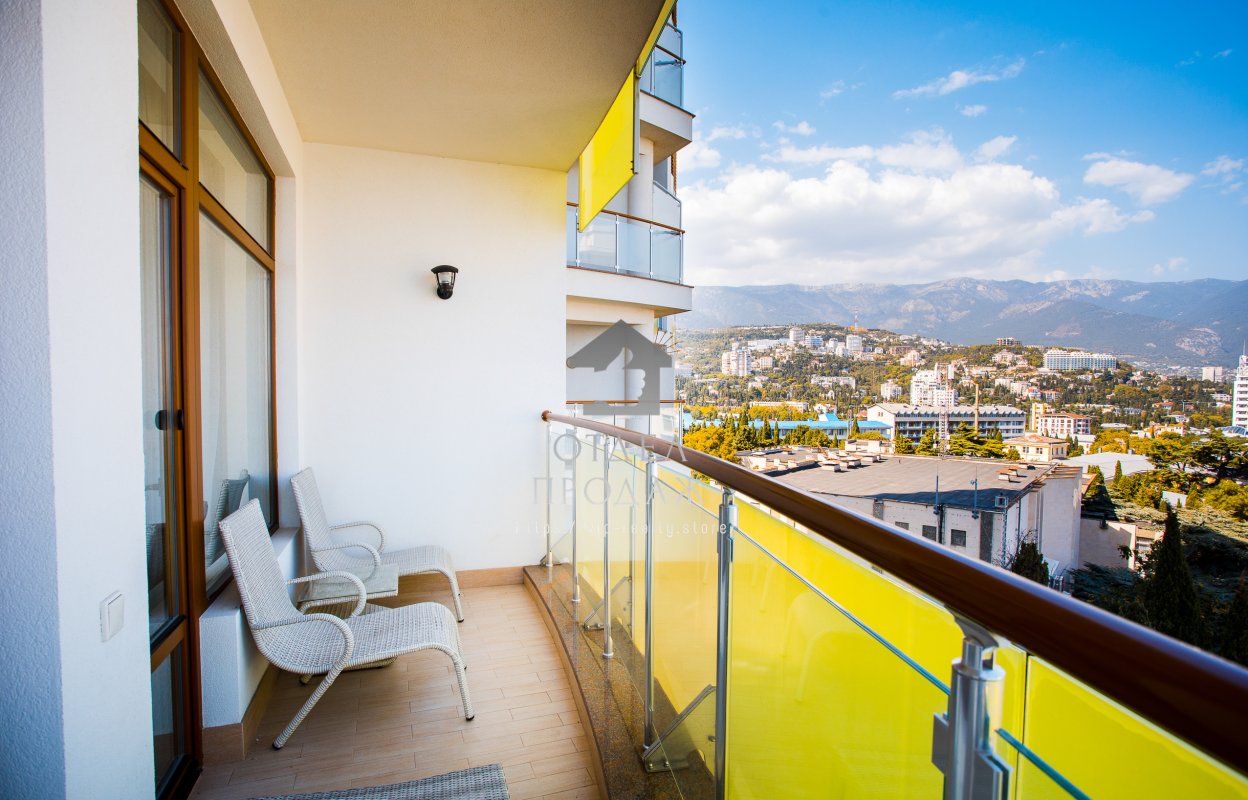 Загальна площа становить - 46.1 кв. м. Виконана дизайнерська обробка з використанням якісних матеріалів, витримана світла колірна гамма, ідеально поєднується з інтер'єром квартири. З відкритої тераси відкривається вид на море, гори і Ялтинську бухту.