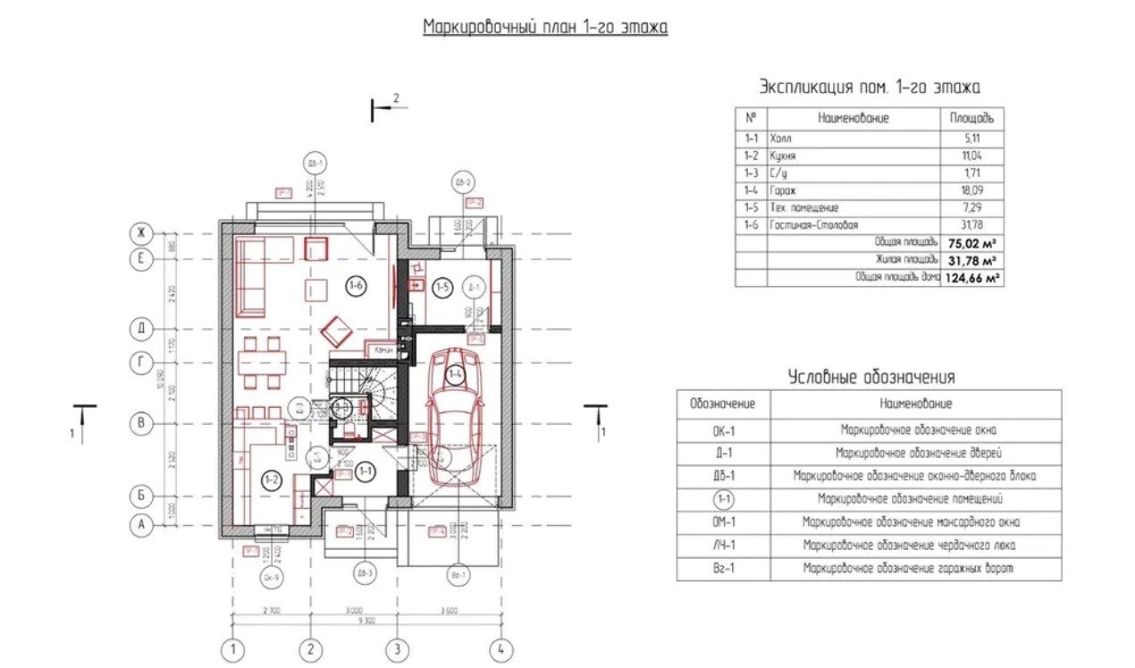 Площа першого поверху – 72,44 кв. м. Там же розміщений гараж, ворота якого працюють в автоматичному режимі. Площа гаража 18,5 кв. м, а ще понад 7 квадратів виділено під котельню. На першому поверсі є: