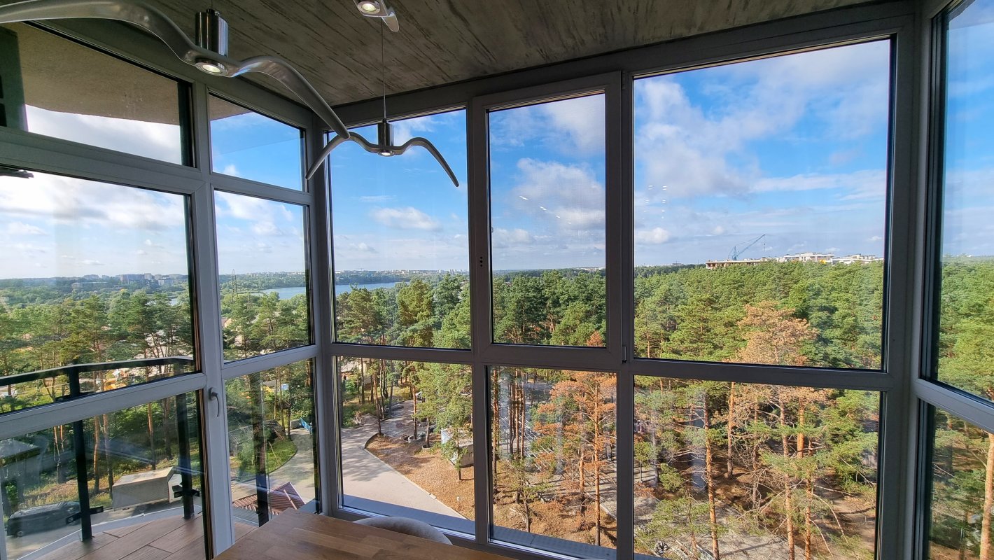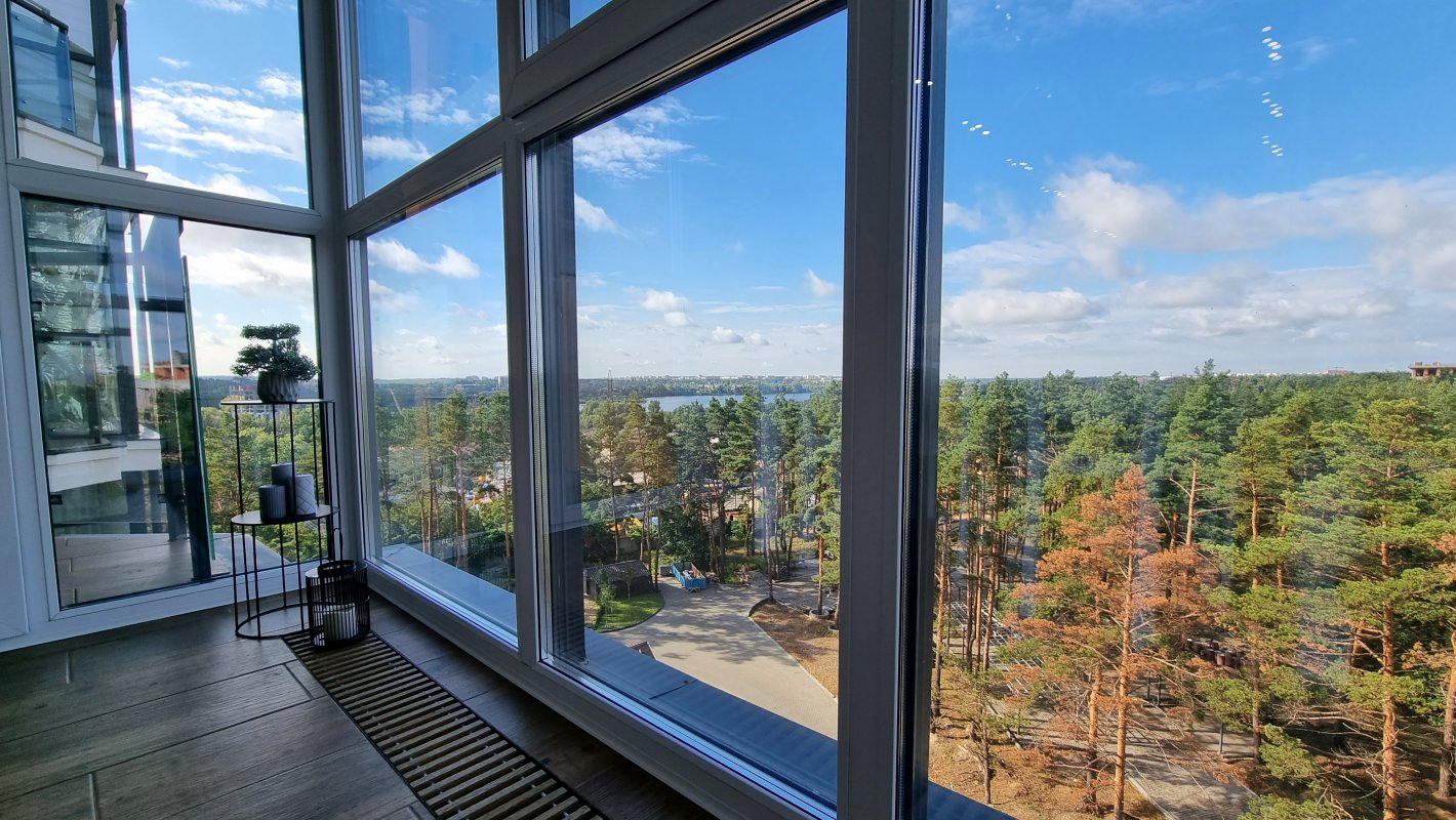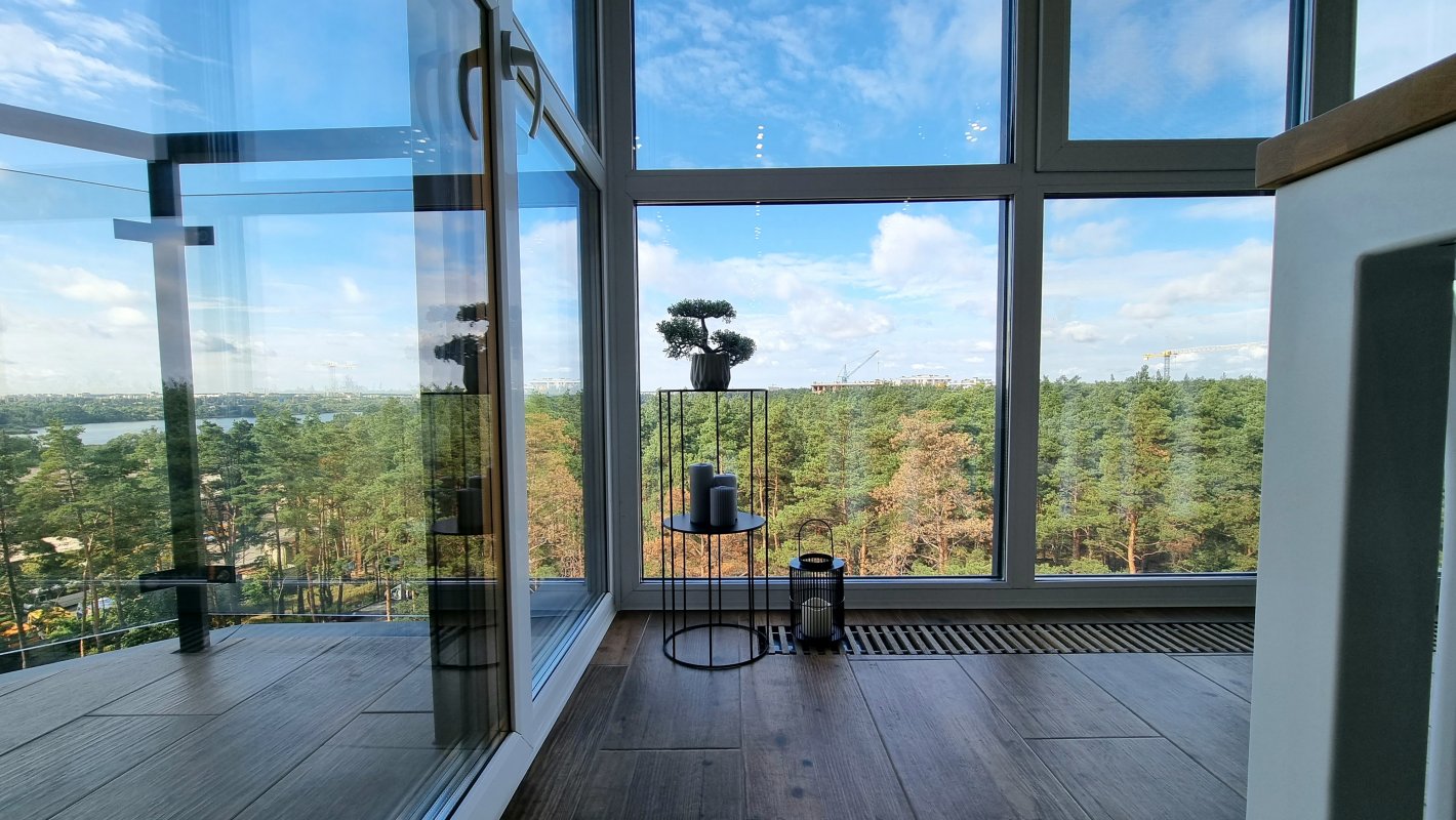Дві окремі кімнати та велика кухня-вітальня з панорамними вікнами. Вид відкривається на крони хвойних дерев та озеро. Західна сторона, тому неймовірний краєвид гарантований.