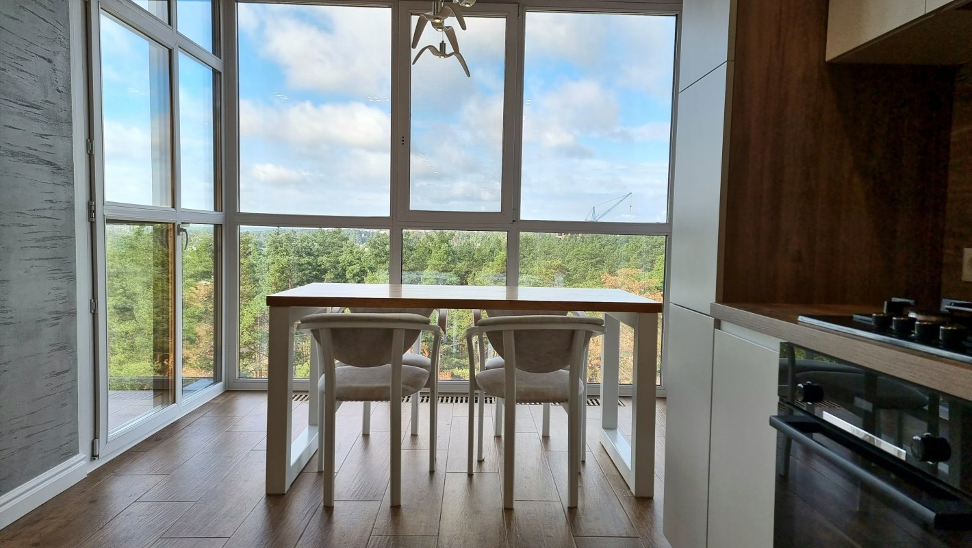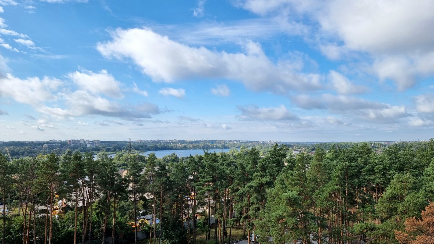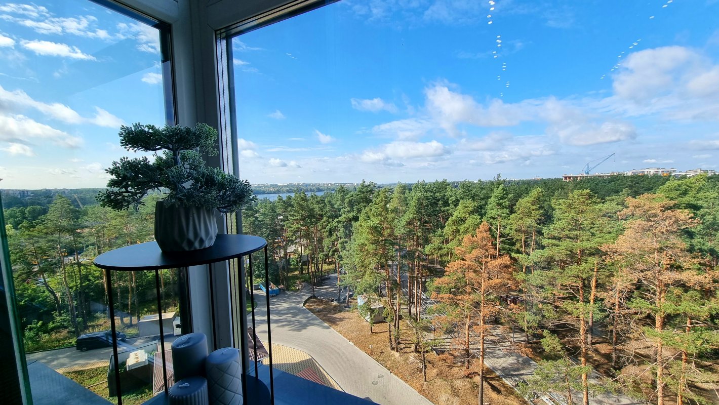 Дві окремі кімнати та велика кухня-вітальня з панорамними вікнами. Вид відкривається на крони хвойних дерев та озеро. Західна сторона, тому неймовірний краєвид гарантований.