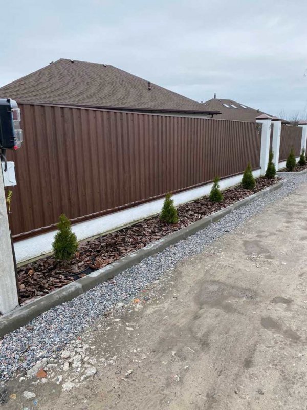 Забор: металевий профіль по периметру ділянки, хвіртка з замком, відкатні ворота;