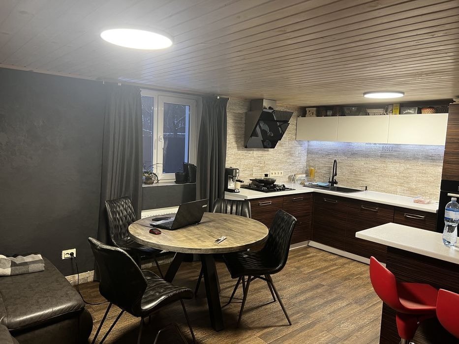 Дом меблирован. Кухня с фурнитурой Blum, варочная поверхность газовая и духовой шкаф Bosch.