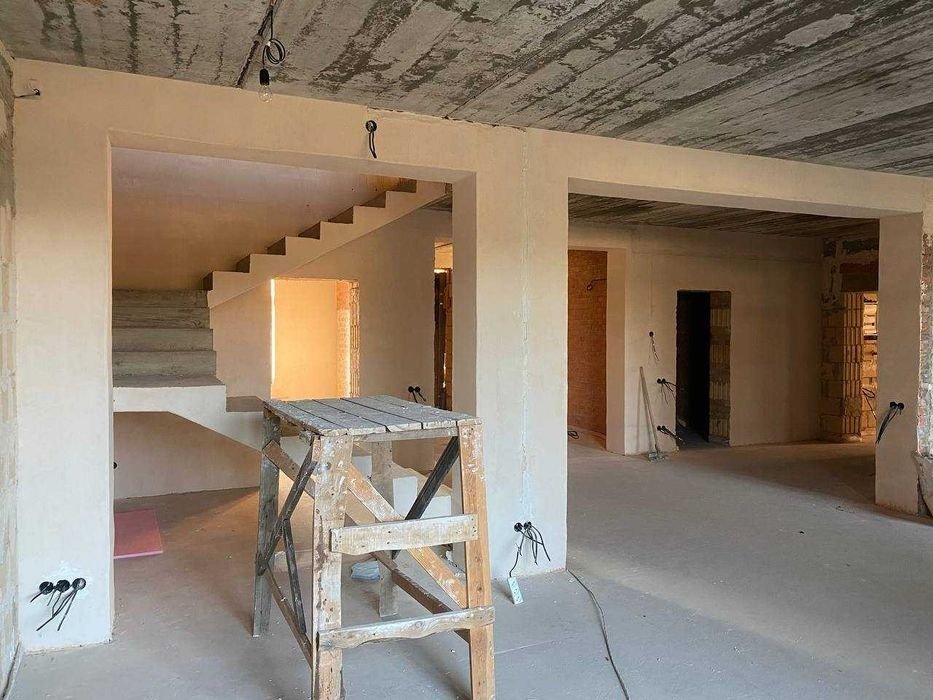 - Простора відкрита кухня об’єднана з вітальнею з виходом на сходи другого поверху, а також виходом на терасу. У вітальні підготовка під камін.