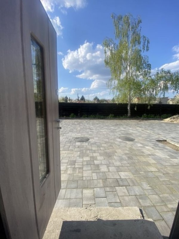 Територія перед будинком вимощена бруківкою.