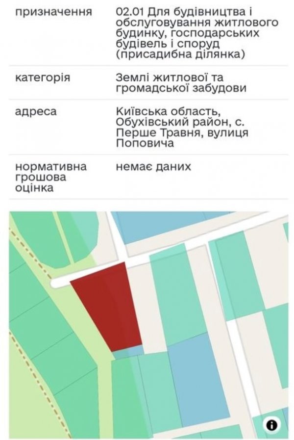 Продам земельну ділянку 27 сот під забудову в с. Перше Травня, вул. Поповича. Дуже гарний краєвид, поряд ліс та озеро, є асфальт до самої ділянки. В районі кілометра є школа, садочок, магазин, лікарня. До Обухова 7 км, до Києва 35 км. По всім питанням звертайтесь по вказаному номеру телефону.