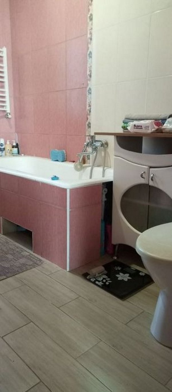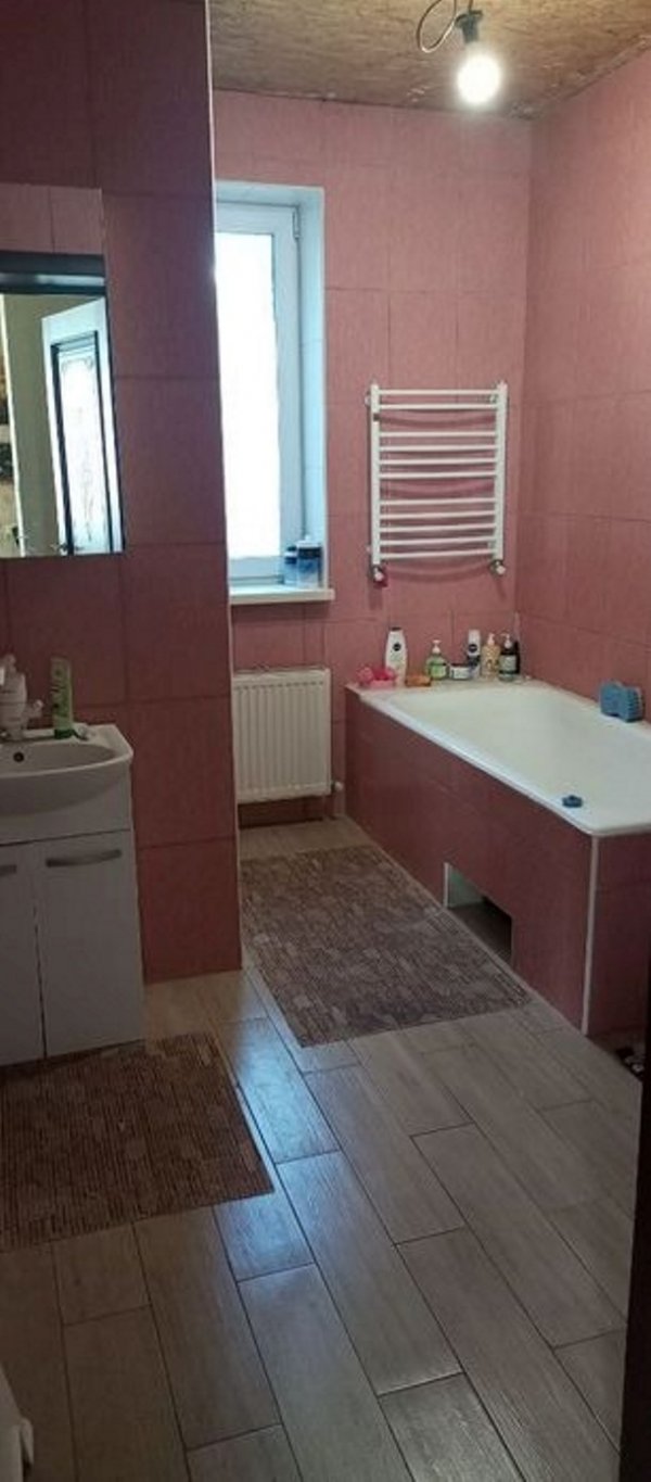 В ванной комнате есть: ванна, душевая, туалет, раковина с зеркалом.