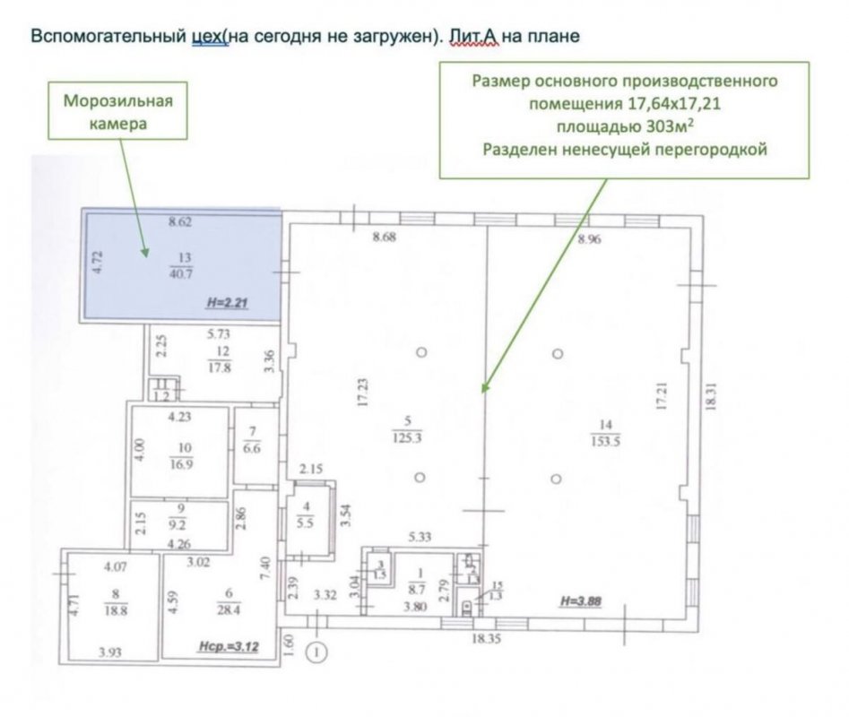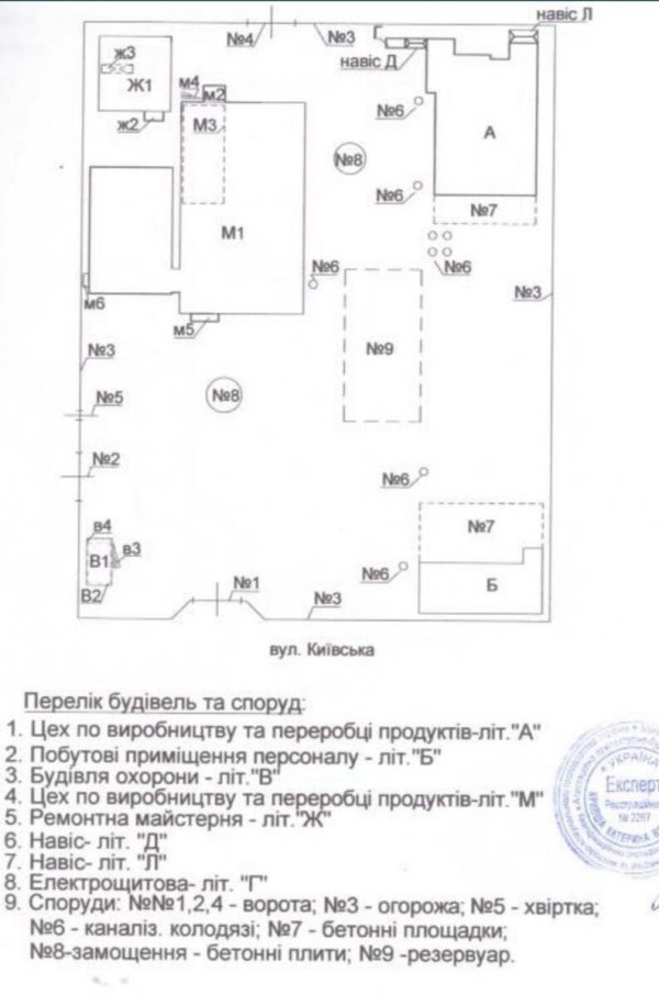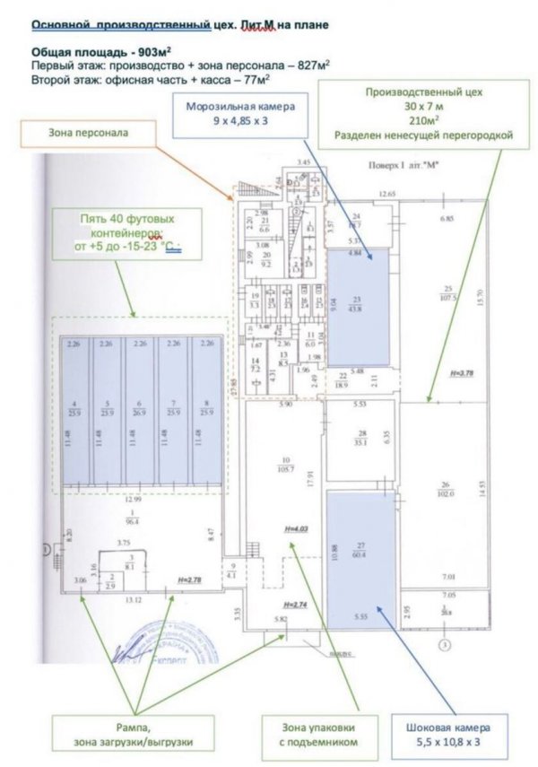 Постройки общей площадью 2210 кв.м; Земельный участок 0,62 га, в собственности + есть возможность увеличить на 27соток; 2 пищевых цеха (основной 904м2 и вспомогательный 437м2); рампа, подъемник; Электричество – около 300 кВт; Водоснабжение – скважина 50 метров; Канализация – жироулавливатель, септик; Общежитие для работников 12 комнат, столовая; . Гаражи и подсобные помещения 192м2. Охлаждающее оборудование: Шоковая камера, -35 °C: 20т; Морозильная камера -20 °C: 20т (на сегодня переоборудована под дефрост); Камеры хранения: 4 ед. 40 футовых контейнера на -15-23 °C ; Камера + 5 °C: 10 т