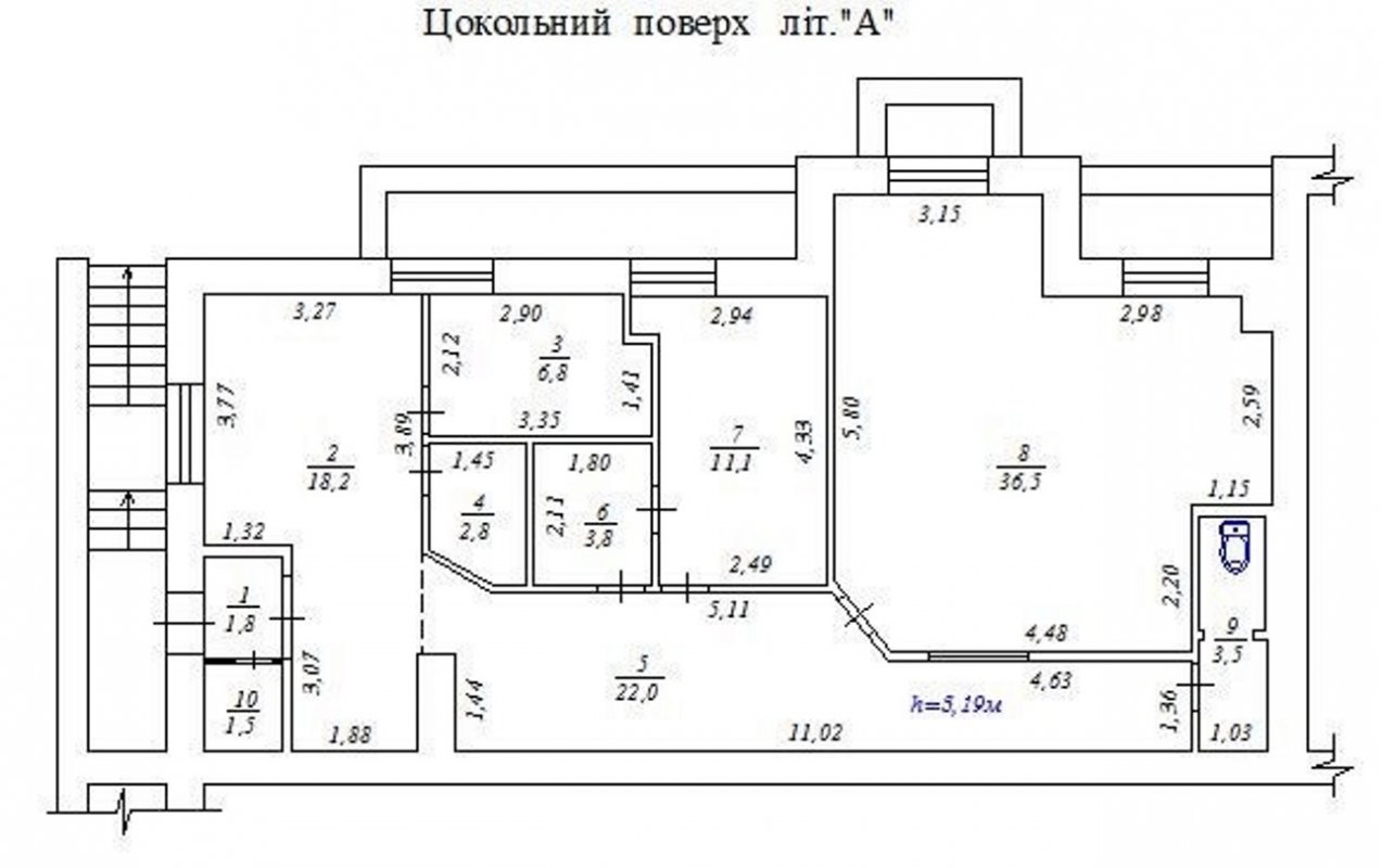 Високий цоколь з вікнами над землею в 11 поверховому будинку, висота стель 3,20 м.