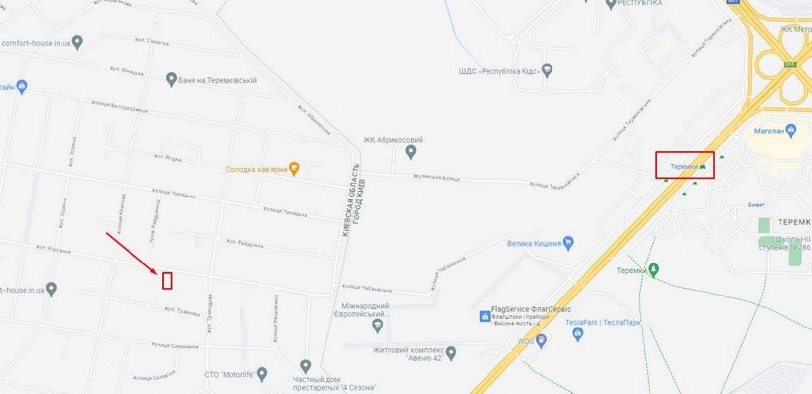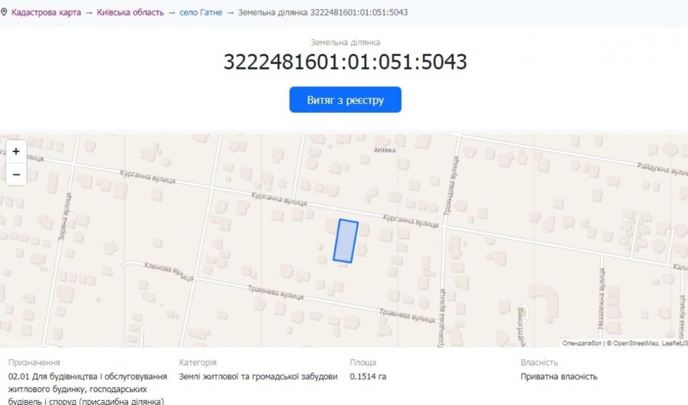 Ділянка землі 15 соток, розташована за 1 км від Києва (с. м. Теремки] в селі Гатне, вул. Курганна, від власника.