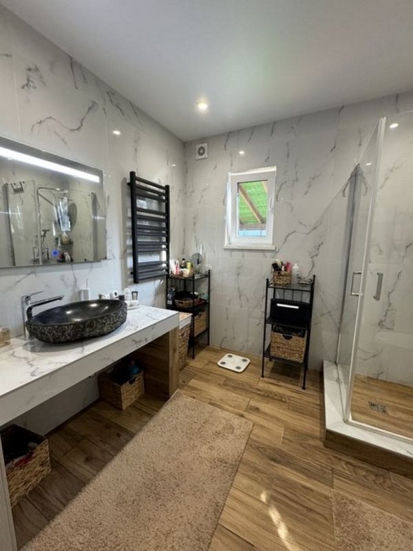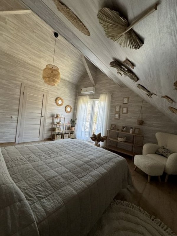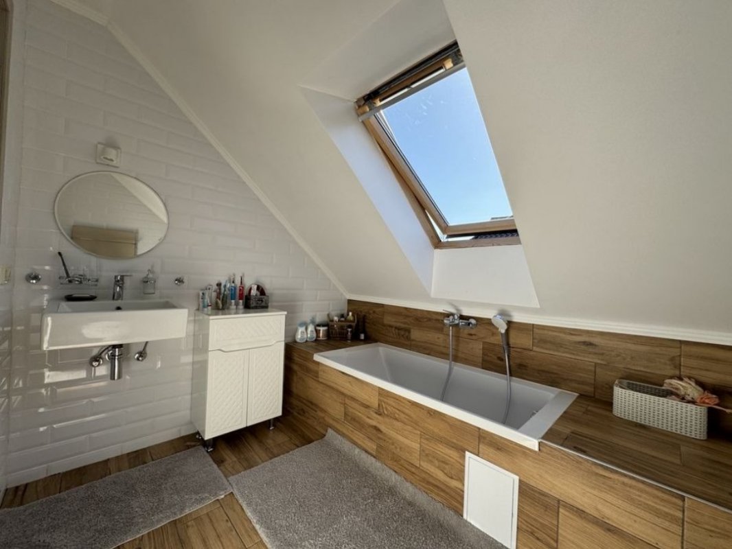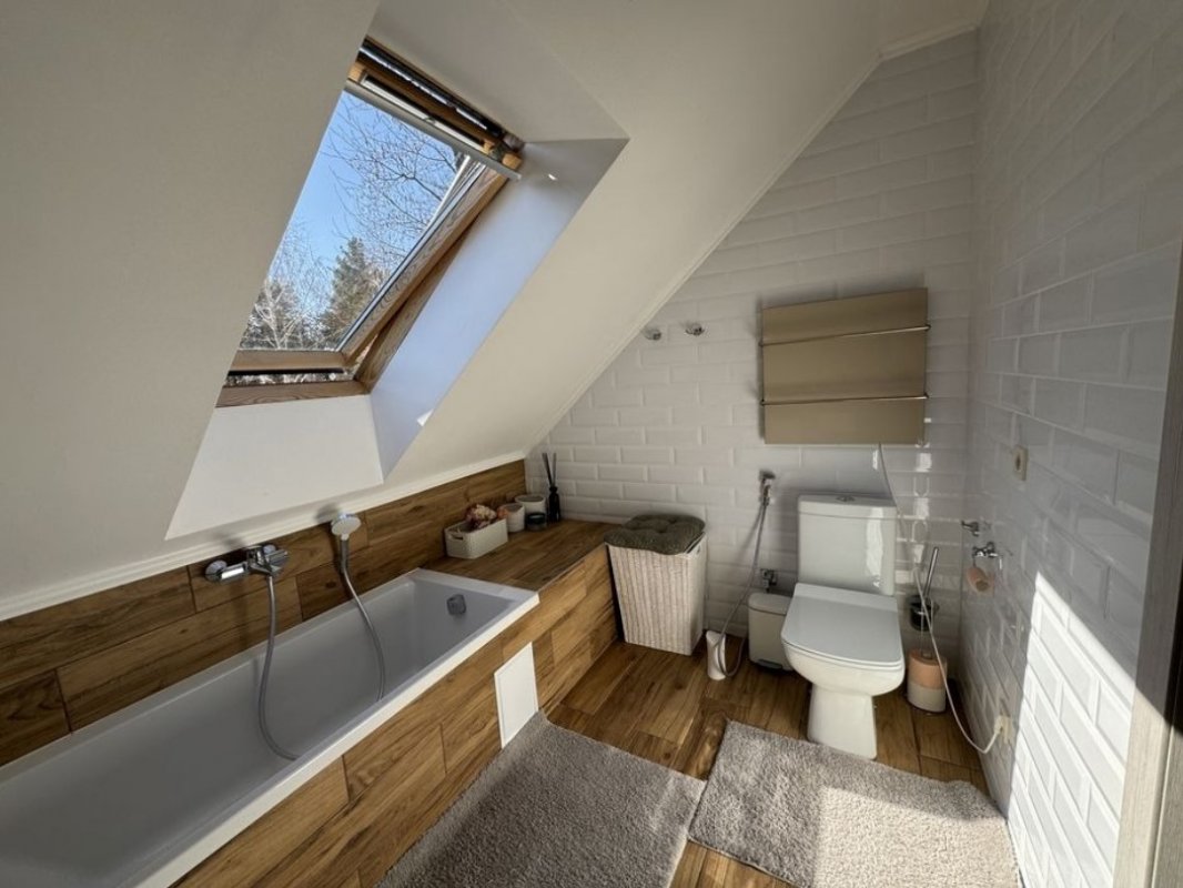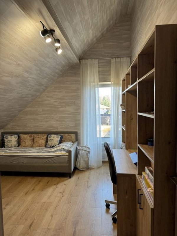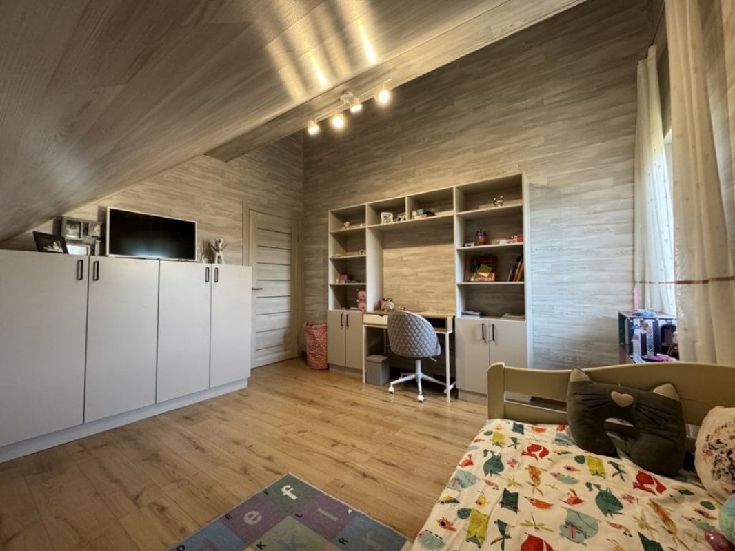 Перший поверх: передпокій; комора; котельня; кабінет (можна використовувати як гостьову кімнату); кухня; вітальня з каміном; санвузол; велика тераса. По всьому першому поверху прокладена тепла підлога (водяна), плитка керамограніт. Другий поверх мансардного типу: 3 спальні; гардероб, санвузол + ванна з вікном; вбиральня.