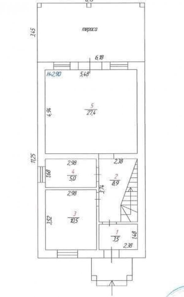 На першому поверсі велика кухня-вітальня (27,4 м2), одна житлова кімната 10,5 м2, санвузол 5,0 м2, передпокій із шафою та місце для кладової під сходами.