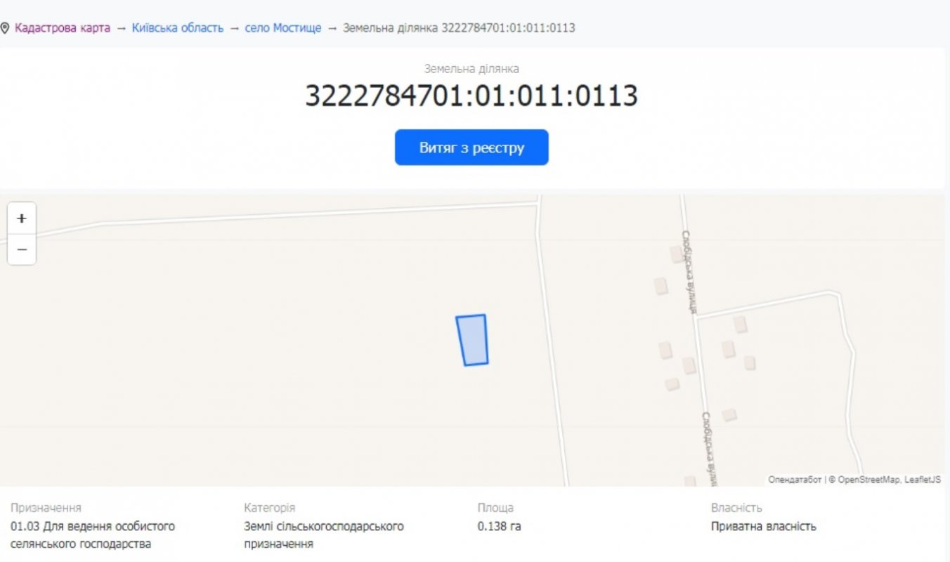 Складається з двох ділянок 25 сот під будівництво та 13,8 сот сільськогосподарського призначення.