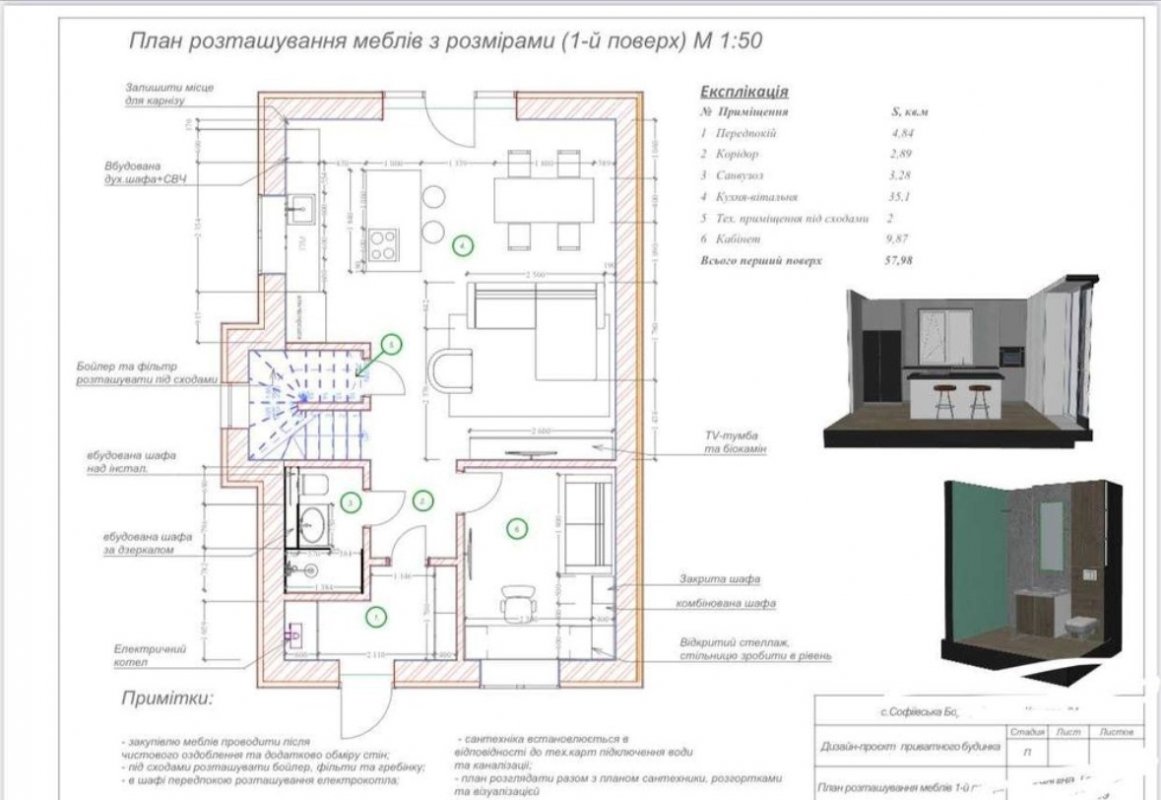 1 поверх: кухня-студія + кімната (кабінет) + санвузол.