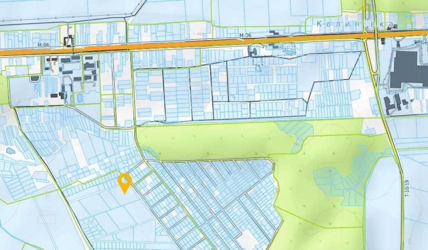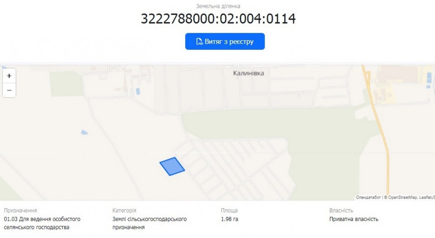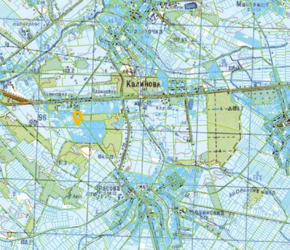 30 км від Києва. Макарівський район. Калинівка. Комунікації електрика, газ в 100 м від ділянки. Земельна ділянка складається з чотирьох частин (чотири кадастрових номери) загальною площею 7,5 га.