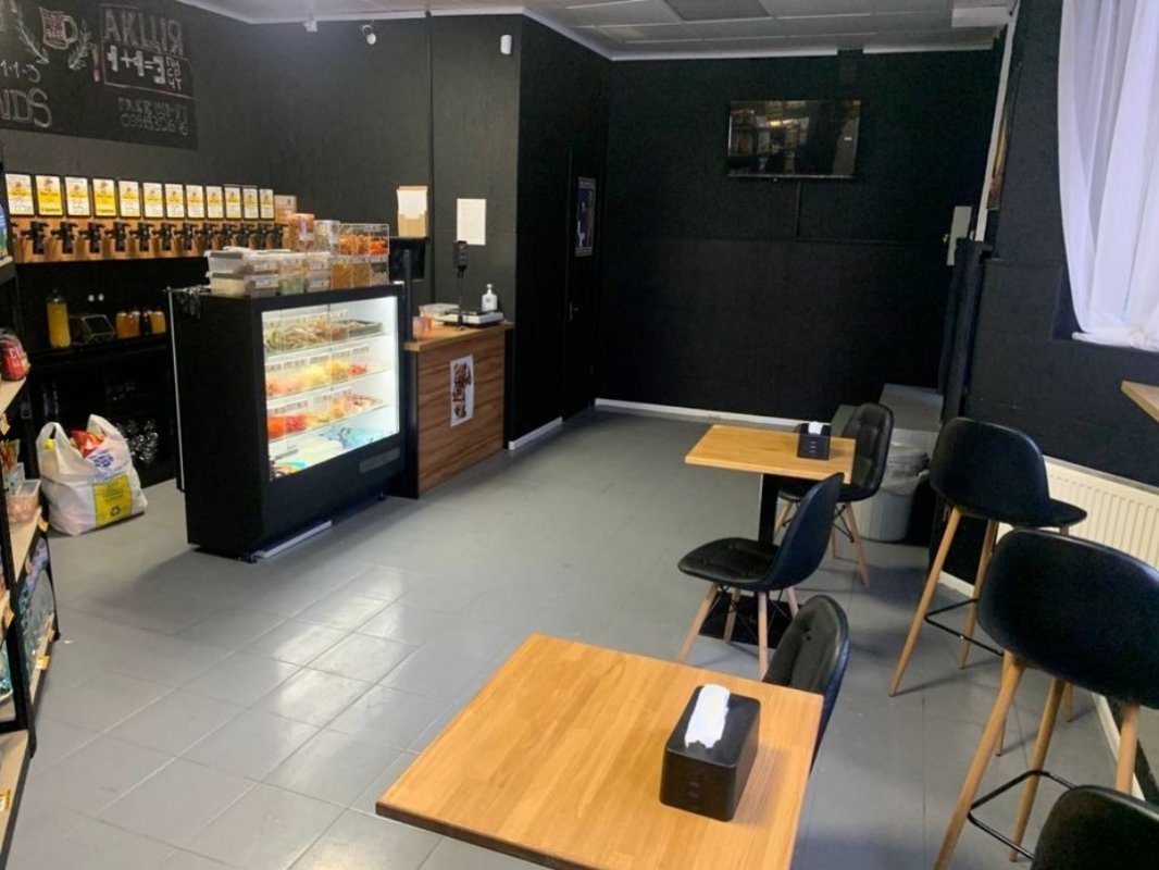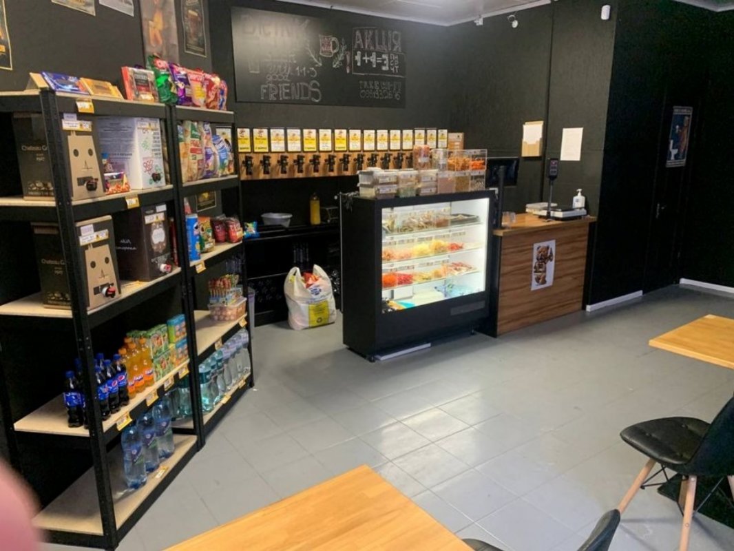Pos термінал ТМ pos sector, принтер pos, ваги електронні, 16 кранів пегас на один потік, два 8-контурних охолоджувачі, два балони 40 літрів з датчиками тиску та ємкості, кондиціонер з датчиками температури який робить в кеговій 7-10 градусів, стелажі в кеговій під приладдя та різні інструменти і тд, ваги для бочок, телевізор 40 дюймів, в магазин заведено оптику (інтернет працює під час вимкнення світла), холодильна вітрина, два столи на 8 місць, барна стійка на 3 місця, власний санвузол (унітаз та раковина), сигналізація/датчики руху (охоронна фірма в сусідньому будинку), камери спостереження в приміщенні, стелажі під снеки та вино.